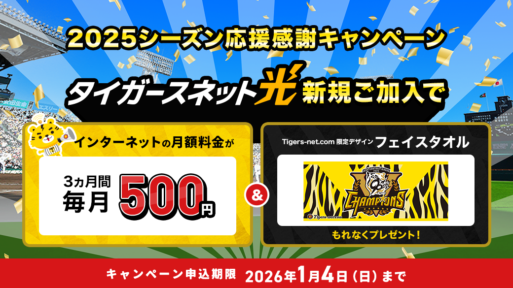 通常マンションプランの場合3,960円/月、戸建てプラン4,950円/月の料金が2ヶ月目~4ヶ月目の3ヶ月間たった500円に! - Tigers-net.com限定デザイン リーグ優勝記念フェイスタオル